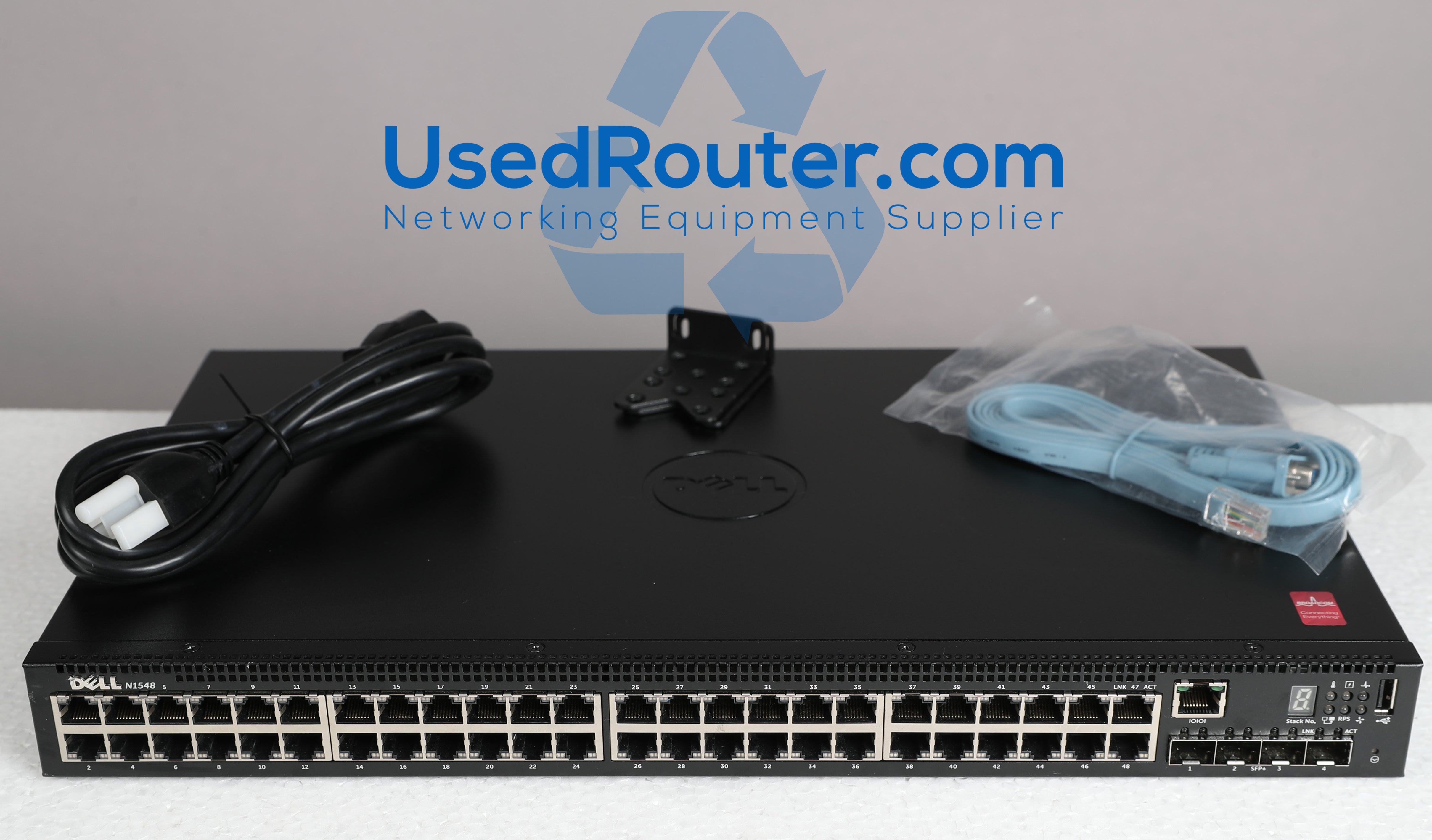 Dell N1548 pre-owned in good condition, some scratches could be present. Comes with rack ears and notched power cord and console cable.